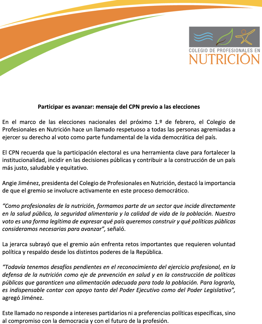 julio 24, 2025 Colegio de Profesionales en Nutrición pone al servicio del paÃs 74 nuevos nutricionistas y 4 especialistas Leer más